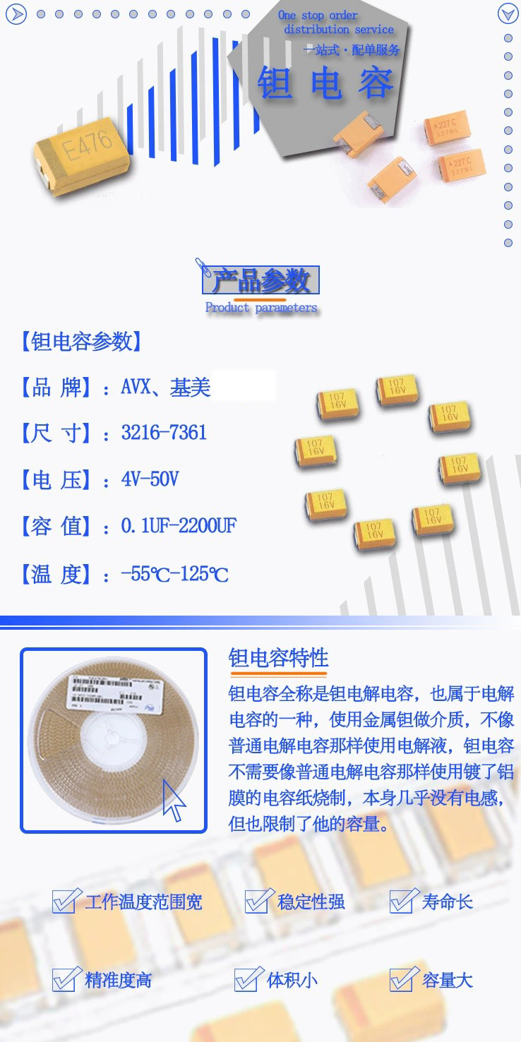 钽电容是电容器中体积小而又能达到较大电容量的产品,是1956年由美国贝尔实验室首先研制成功的,它的性能优异。钽电容器外形多种多样,并制成适于表面贴装的小型和片型元件。